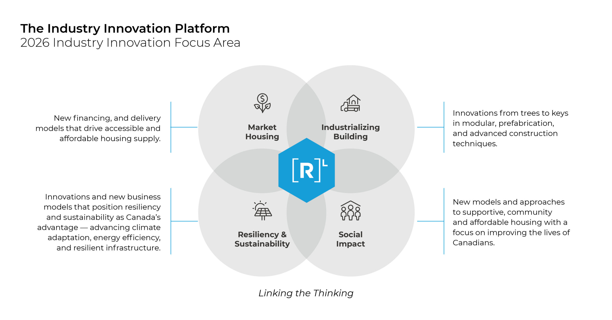 Building on the progress from the Industry Innovation Agendas of 2024 and 2025, industry leaders including the R-LABS I+T Council, have aligned on the need for a more integrated approach to housing innovation through four focus areas as priorities for advancing industry innovation: Market Housing, Industrializing Building, Resiliency & Sustainability, and Social Impact. Together, they reflect where coordinated action is most needed to address the immediate and long-term market and community outcomes.